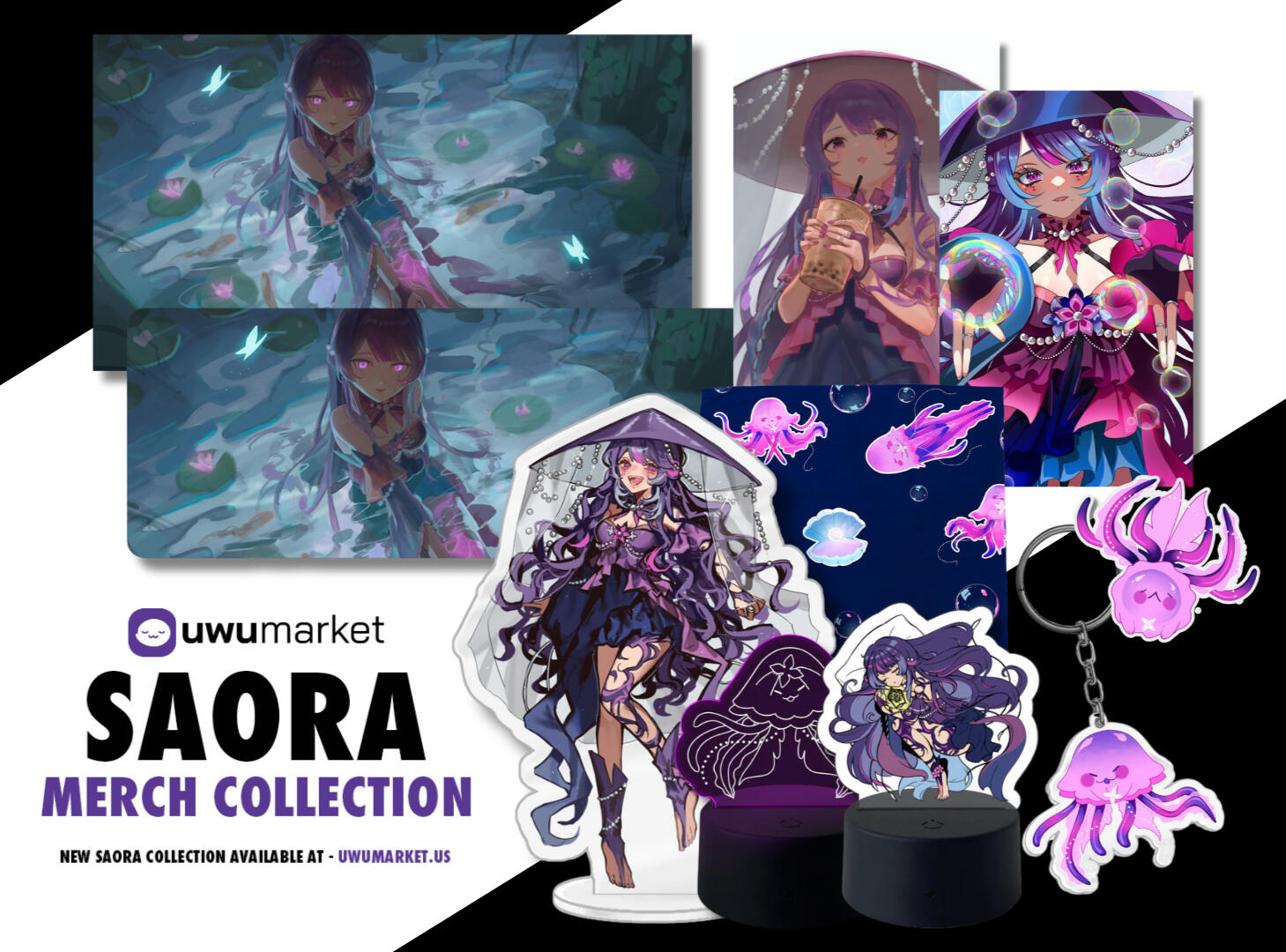 Featuring a deskmat, keychain, magnet, sticker sheet, wall tapestry, and boba cup holder!